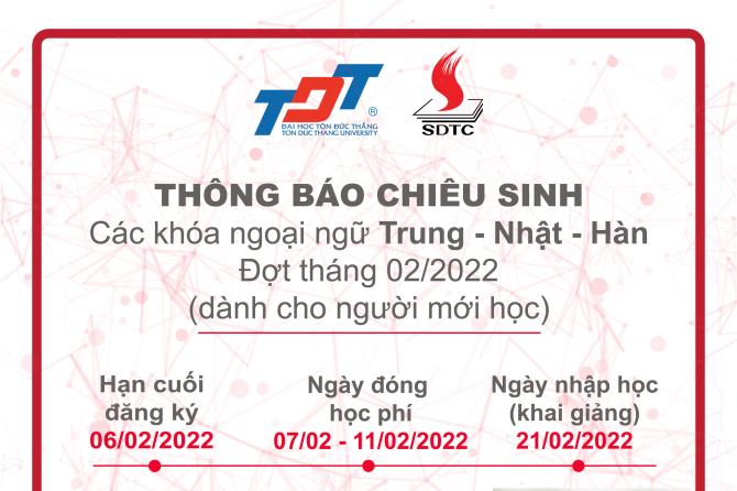 Thông báo chiêu sinh các khóa ngoại ngữ Trung - Nhật - Hàn đợt tháng 02/2022